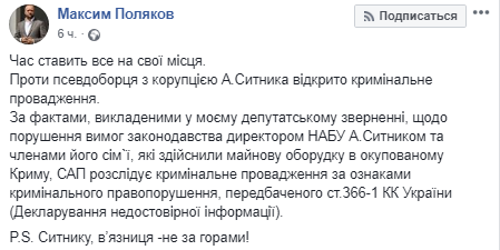 "По фактам, изложенным в моем депутатском обращении, о нарушении требований законодательства директором НАБУ Сытником и членами его семьи, совершивших имущественную сделку в оккупированном Крыму, САП расследует уголовное производство по признакам уголовного преступления, предусмотренного статьей 366-1 Уголовного кодекса Украины", - написал Максим Поляков.