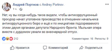 "Нет, ну вы когда-нибудь такое видели, чтобы антикоррупционный прокурор начал уголовное производство в отношении начальника антикоррупционного бюро и ещё и по инициативе подозреваемого этими двумя органами депутата Народного Фронта. Мыльная опера вместе с дурдомом уехали во внеочередной отпуск", - отметил он.