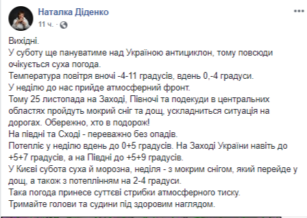"Поэтому 25 ноября на Западе, Севере и местами в центральных областях пройдут мокрый снег и дождь, усложнится ситуация на дорогах. Осторожно, кто в путешествии! На юге и востоке - без осадков. Потеплеет в воскресенье днем до 0 +5 градусов. На Западе Украины даже до +5 +7 градусов, а на юге до +5 +9 градусов", - обещает Диденко.