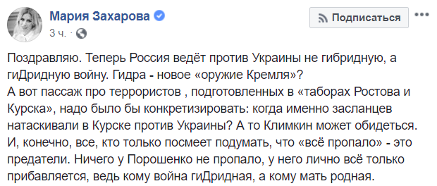 Слова украинского президента про "гидридную войну"прокомментировала официальный представитель МИД РФ Мария Захарова. "Гидра - новое "оружие Кремля"? - иронизирует она.