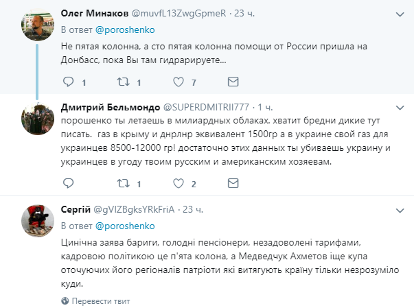 "Не пятая колонна, а сто пятая колонна помощи от России пришла на Донбасс, пока вы там гидрарируете...", - отвечают в соцсети.