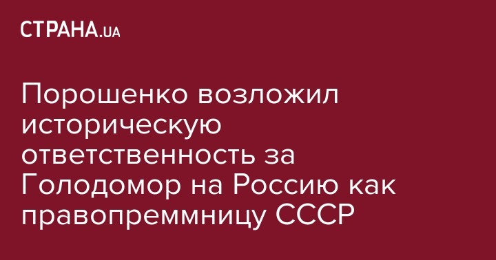 По мнению Петра Порошенко, Российская Федерация является провопреемницей СССР, поэтому она несет историческую ответственность за Голодомор 1932-1933 годов в Украине. Об этом пишет "Интерфакс".