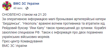 "По оперативной информации малые бронированные артиллерийские катера "Бердянск", "Никополь" были поражены огнем противника и потеряли ход. Рейдовый буксир "Яны Капу" также вынужден был остановиться. Корабли захвачены спецназом РФ. Также есть информация о двух раненых украинских военных моряков", - сообщил пресс-центр.