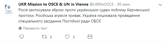 "Россия использовала военную силу против украинских судов вблизи Керченского пролива. Российская агрессия не ослабевает. Украина инициировала специальное заседание Постоянного совета ОБСЕ", - говорится в сообщении посольства в Твиттер.