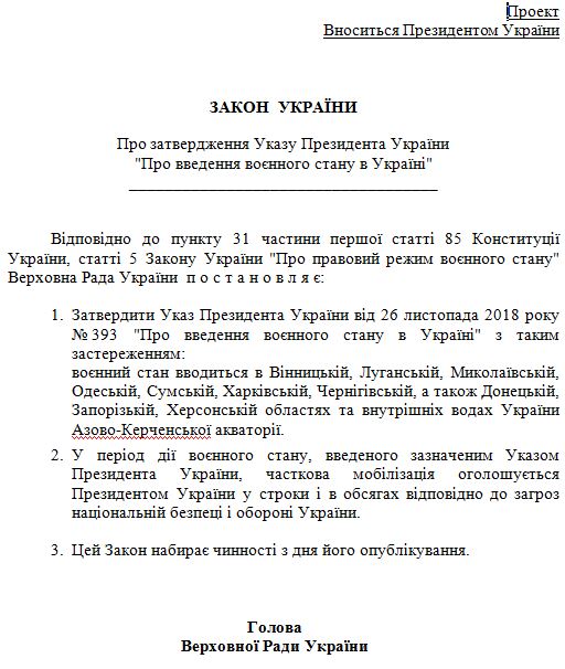 1. Утвердить Указ Президента Украины от 26 ноября 2018 № 393 "О введении военного положения в Украине" со следующей оговоркой: