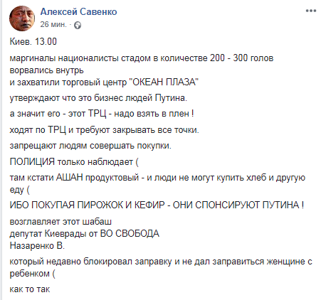 По его словам, около 13:00 группа националистов, состоящая из 200-300 человек, ворвалась в здание ТРЦ Ocean Plaza и захватила его. Активисты утвтерждают, что это бизнес людей Путина, а значит его нужно блокировать.