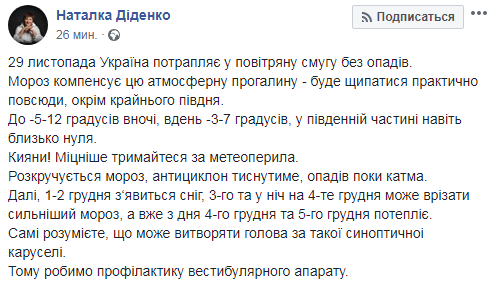 В четверг, 29 ноября, Украина попадает в воздушную полосу без осадков. Также во всех регионах кроме крайнего юга ожидается морозная погода -5...-12 градусов ночью и ​​-3-7 С днем. В южной части Украины около нуля.