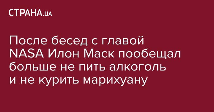 После беседы с главой NASA Джимом Брайденстайном о своем поведении глава компании Space X Илон Маск пообещал ему больше не показываться с марихуаной или алкоголем. Об этом в пятницу, 29 ноября, сообщает The Atlantic.