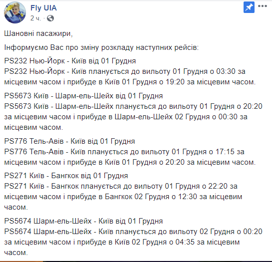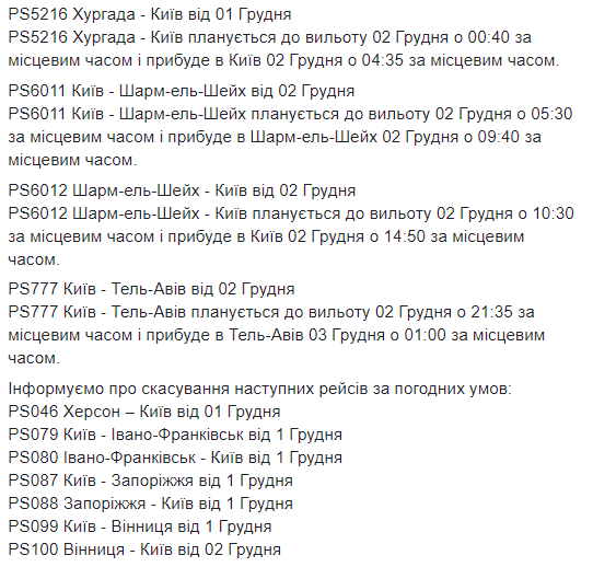 Рейс PS232 из Нью-Йорка в Киев планируется к вылету 1 декабря в 03:30 по местному времени и прибудет в Киев 1 декабря в 19:20 по местному времени. Рейс PS5673 Киев - Шарм-эль-Шейх планируется к вылету 1 декабря в 20:20 по местному времени и прибудет в Шарм-эль-Шейх 2 декабря в 00:30 по местному времени. Рейс PS776 Тель-Авив - Киев планируется к вылету 1 декабря в 17:15 по местному времени и прибудет в Киев 1 декабря в 20:20 по местному времени. Рейс PS271 Киев - Бангкок планируется к вылету 1 декабря в 22:20 по местному времени и прибудет в Бангкок 2 декабря в 12:30 по местному времени.
