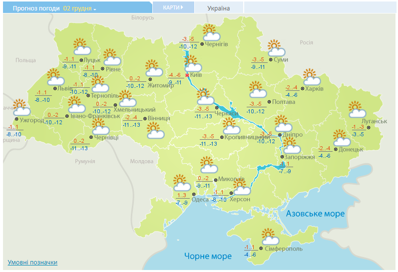 В центре Украины 2 декабря осадки не ожидаются. Ночью столбики термометров упадут до -9-11 мороза, днем ​​-3-5.