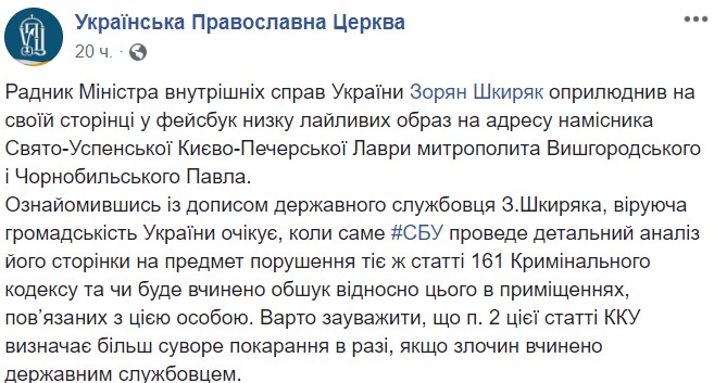 "Верующая общественность Украины ожидает, когда Служба безопасности Украины проведет детальный анализ его (Шкиряка - ред.) страницы на предмет нарушения той же статьи 161 Уголовного кодекса и проведет обыск в помещениях, связанных с этим лицом. Стоит заметить, что п. 2 этой статьи УК определяет более суровое наказание в случае, если преступление совершено государственным служащим", - говорится на Facebook-странице УПЦ МП.