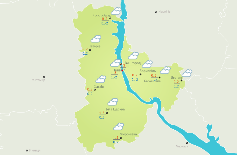 Дождь возможен только в западных регионах и Житомирской области. На остальной территории страны осадков не будет, за исключением тумана и гололеда. Ветер преимущественно южный, 5-10 м/с. Температура в течение суток будет колебаться от 2° мороза до 3° тепла (в южных и западных областях днем 2-7° тепла); в восточной части ночью 4-9° мороза, днем около 0°.