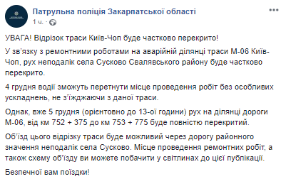 В связи с ремонтными работами на аварийном участке трассы М-06 Киев - Чоп, движение возле села Сусково Свалявского района 4 декабря будет частично перекрыто. 5 декабря проезд будет заблокирован полностью. Об этом сообщает в соцсети пресс-служба Патрульной полиции Закарпатской области.