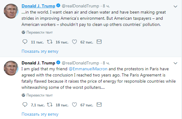 "Я рад, что мой друг Эммануэль Макрон и протестующие в Париже согласились с выводом, к которому я пришел два года назад. Парижское соглашение имеет огромные недостатки, потому что оно повышает цену энергии для ответственных стран и обеляет некоторых из худших загрязнителей в мире.... Я хочу чистый воздух и чистую воду... Но американские налогоплательщики - и американские работники - не должны платить за очистку загрязнений других стран", - написал Трамп.