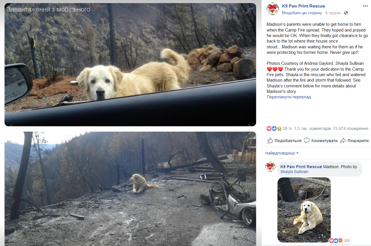 После лесных пожаров, огненным катком прокатившихся по Калифорнии стало известно о необычном случае. Собака по кличке Мэдисон вернулась на пепелище дома и почти месяц ждала своих хозяев.