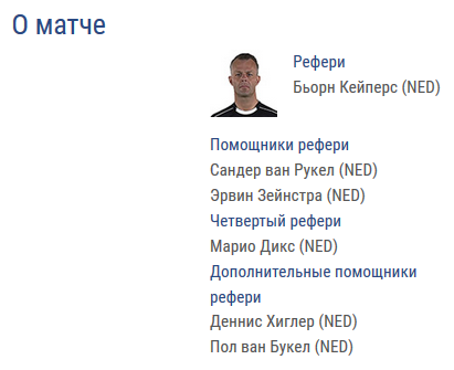 На линиях Кейперсу будут помогать Сандер ван Рукел и Эрвин Зейнстра. Четвертым рефери стал Марио Дикс. Дополнительные арбитры - Деннис Хиглер и Пол ван Букел.