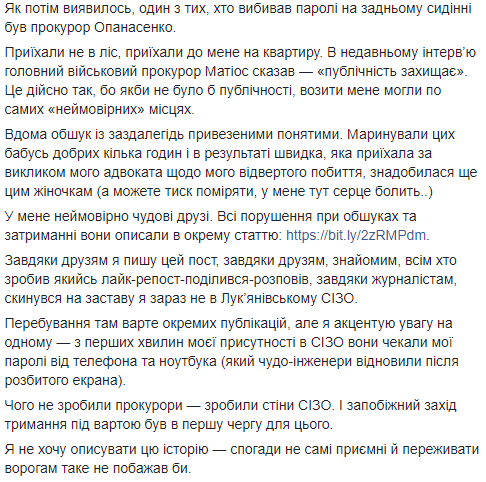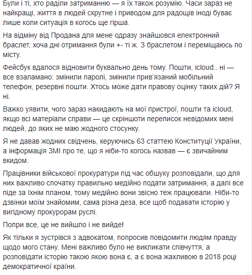 "Я не давал никаких показаний, руководствуясь 63 статьей Конституции Украины, а информация СМИ о том, что я будто бы кого-то назвал, является обычным вбросом... Как только я встретился с адвокатом, попросил сообщить людям правду о моем состояния. Мне важно было не вызывать сочувствия, а рассказывать историю такой, какая она есть, а она является ужасной в демократической стране 2018 года", - заключил он.