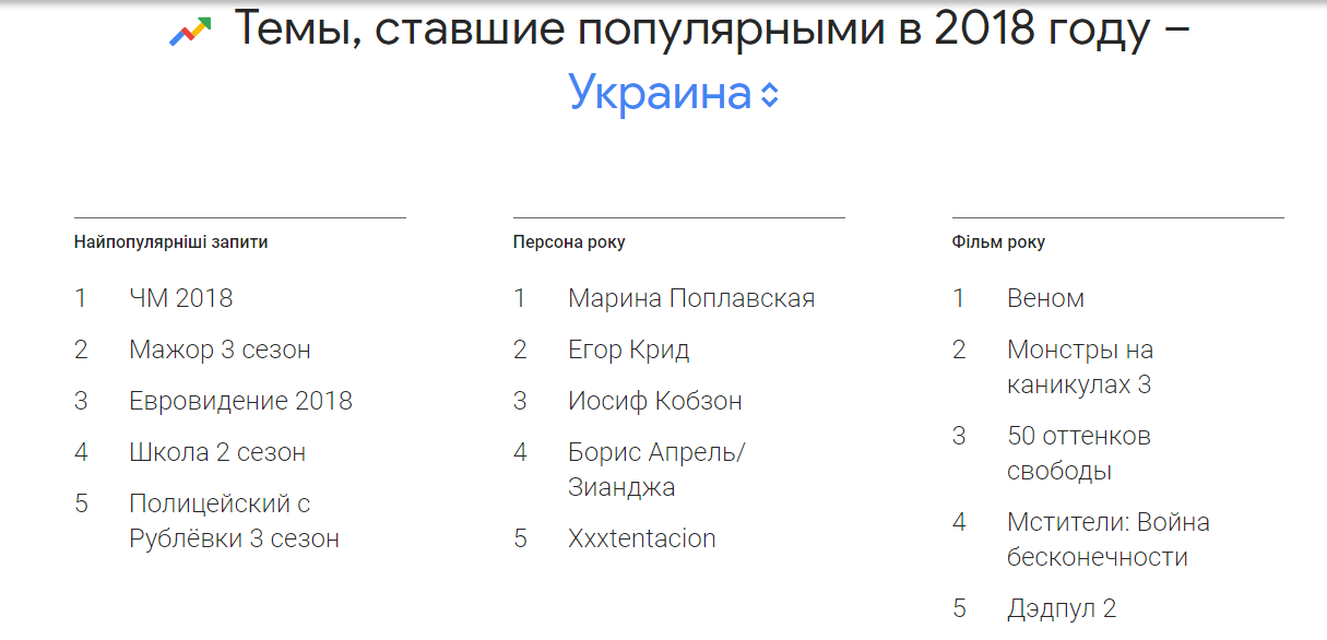 Напомним, согласно данным Google, персоной года в Украине стала погибшая в ДТП звезда "Дизель шоу" Марина Поплавская. На втором месте расположился певец Егор Крид. Третье место занял умерший в 2018 году певец Иосиф Кобзон. Далее разместились певец Борис Апрель, который сменил пол, и погибший американский рэпер XXXTentacion.