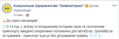 В Киеве сегодня, 12 декабря, в связи с ухудшением погодных условий общественный транспорт курсирует без определенного графика. Об этом сообщила пресс-служба "Киевпасстранса" в Facebook.