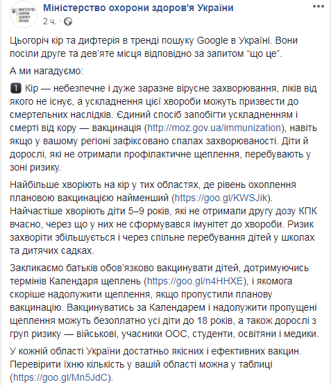 С начала 2018 года в Украине корью заболели 46 937 человек (17 418 взрослых и 29 519 детей).