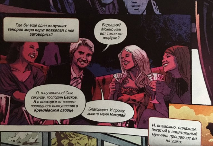 В частности, в статье говорится: "Николай Басков - оперный певец, считающийся одним из величайших теноров в мире. Николай Басков посетил один из самых горячих ночных клубов Москвы, флиртовал с женщинами и пригласил одну из хостесс выпить. Он не знал, что хостесс на самом деле была агент Щ.И.Т.а Наташа Романова, которая выполняла секретную миссию по сближению с российским торговцем оружием Михаилом Федоровым".