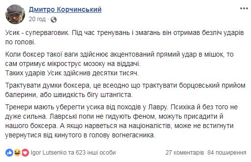 Кроме того, оскорбительные заявления в адрес украинского боксера и монахов Украинской Православной Церкви Корчинский опубликовал 13 декабря на своей странице в Facebook. Резюмировал он свой "пост" угрозой: "А если нарвется на националистов, может не успеть увернуться от брошенного в голову огнетушителя".