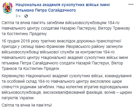 Авария случилась 16 декабря в поселке Ивано-Франково Яворивского района. Военнослужащие Назарий Пастерук, Виктор Транков и Константин Прядеин служили по контракту в 184-м учебном центре Национальной академии сухопутных войск имени гетмана Петра Сагайдачного.