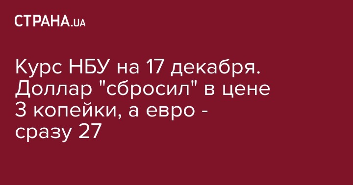 Курс НБУ на 17 декабря. Доллар "сбросил" в цене 3 копейки, а евро - сразу 27