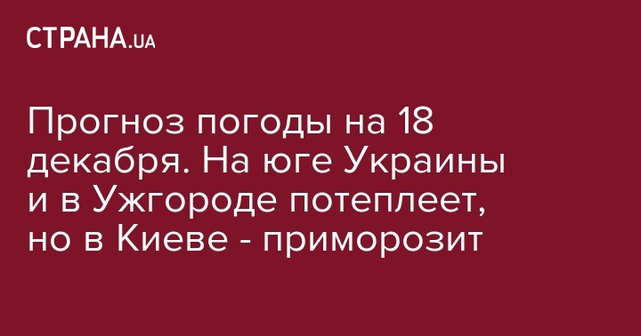 Холоднее всего будет на севере Украины, где ночью обещают до -12, а днем ​​до -8. В остальных областях температура будет немного выше, в Ужгороде днем температура поднимется до +1. В западной части страны пройдут снегопады. Днем здесь будет  -1...-4. В Карпатах 18 декабря также будет идти снег. Дневная температура в горной местности -1...-3 мороза.