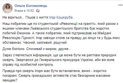 О смерти Игоря Коцюрубы на своей странице в соцсети написала также "главврач Майдана" Ольга Богомолец. Она призвыла генпрокурора взять под личный контроль расследование смерти активиста.