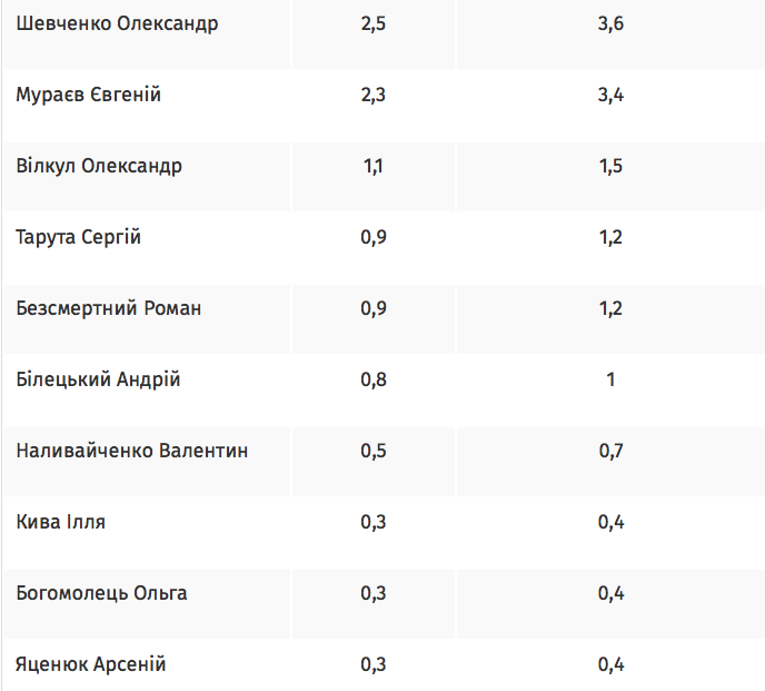 Сопредседатель фракции "Оппозиционный блок" в Верховной Раде Украины Александр Вилкул – 1,1% (1,5%). Таким образом, политик, которого "ахметовская" часть "Оппоблока" решила выдвинуть в президенты, оказался за пределами топ-10.