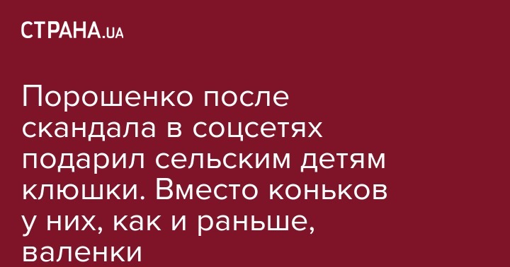 Президент Украины Петр Порошенко подарил сельским детям хоккейные клюшки, сообщил он в Facebook. Это произошло после того, как в соцсетях разразился скандал с его неудачным пиаром, когда он сделал фотографию с сельскими детьми-хоккеистами, у которых были самодельные клюшки, а коньков не было вовсе.