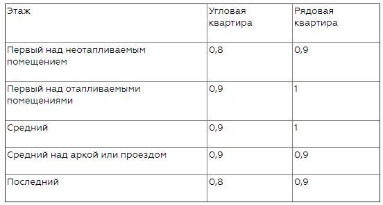 Методика также предусматривает применение поправочных коэффициентов для распределения объема потребленной тепловой энергии между потребителями в угловых квартирах, квартирах, расположенных на первых и последних этажах зданий и т.п. Поправочные коэффициенты рассчитываются на основе проектных величин теплопотерь помещений для каждого отдельного здания. В случае отсутствия проектных данных по теплопотерям отдельного здания или аналогичных зданий используются упрощенные поправочные коэффициенты, применяемые для каждой квартиры: