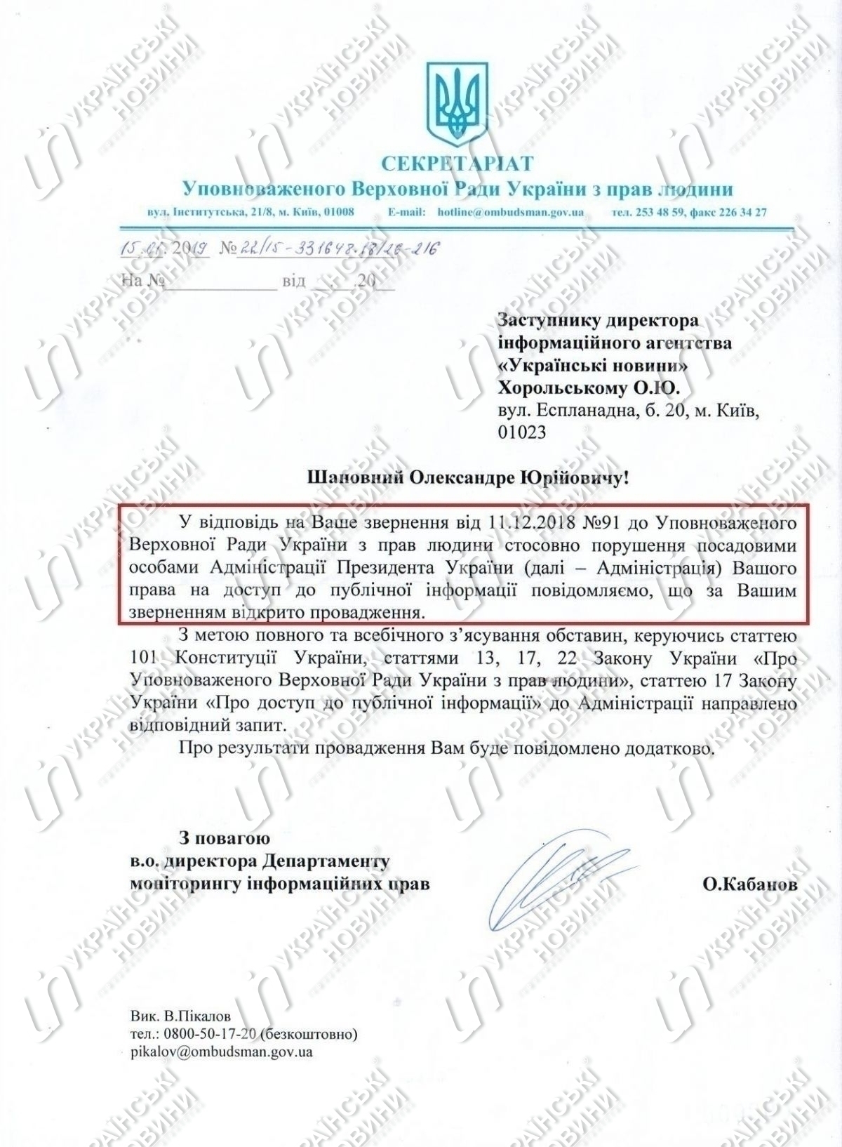 "В ответ на Ваше обращение от 11.12.2018 №91 к Уполномоченному Верховной Рады Украины по правам человека о нарушении должностными лицами Администрации Президента Украины (далее - Администрация) Вашего права на доступ к публичной информации сообщаем, что по Вашему обращению открыто производство", - сказано в документе.