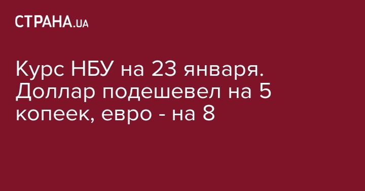 Национальный банк Украины на среду, 23 января, установил официальный курс основных валют по отношению к гривне. По сравнению с предыдущим банковским днем доллар подешевел на 5 копеек. Об этом говорится на официальном сайте регулятора.