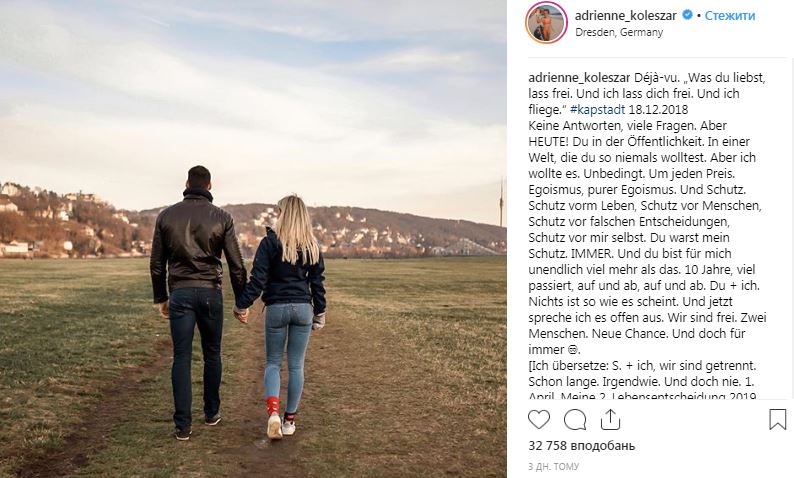 Адриенна Колешар заявила, что ее десятилетние отношения с молодым человеком закончились, так как он не захотел делить ее со 700 000 подписчиками. Делясь фотографией, на которой она держится за руки со своим парнем, она написала: "нет ответов, много вопросов". Она назвала это своим "вторым жизненным решением 2019 года", сказав, что она уедет из их общего дома через десять недель.