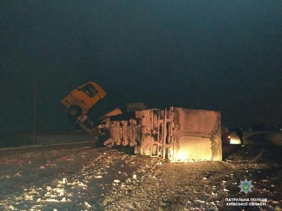 Под Киевом фура перевернулась и эффектно стала "напопа" прямо посреди дороги. Фото