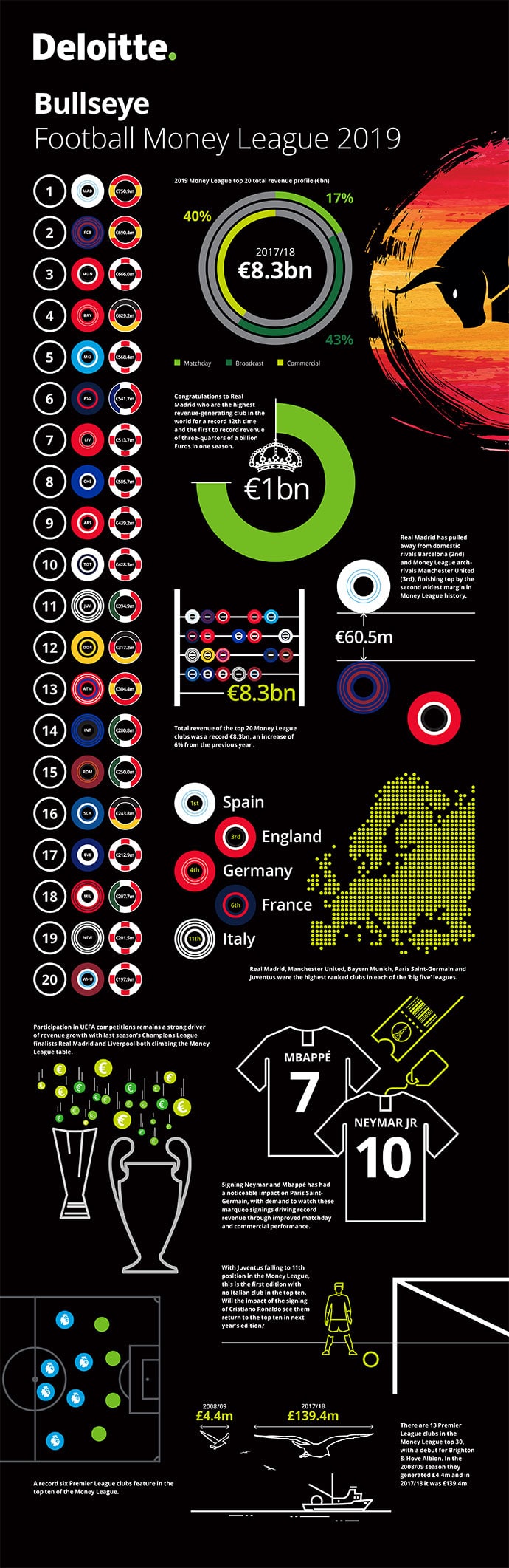 Совокупный доход 20 самых богатых футбольных клубов мира увеличился в прошлом сезоне на 6% и составил рекордные 8,3 млрд евро.