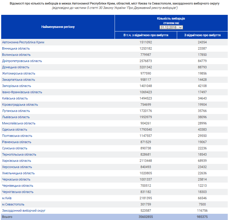 Ведомство подсчитало, сколько людей может проголосовать на выборах президента, которые состоятся в марте. Их будет около 35,6 миллионов. Причем сюда входят и проживающие на неподконтрольных территориях.