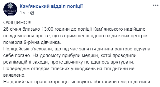 "26 января около 13:00 часов в полицию Каменского поступило сообщение о том, что в помещении одного из детских центров умерла 9-летняя девочка", - сообщили в полиции.