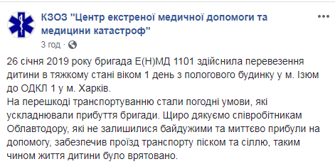 "26 января 2019 бригада Е (Н) МД 1101 осуществила перевозку ребенка в тяжелом состоянии в возрасте 1 день из роддома в г. Изюм в ОДКБ 1 в г. Харьков", - сообщили медики.