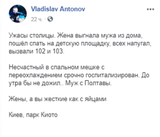 В Киеве в парке Киото прохожие заметили тело, замотанное в спальном мешке. Оказалось, что жена выгнала мужа из дома. Об этом сообщает Владислав Антонов в сообществе ДТП. Киев.ua в Facebook. "Несчастный в спальном мешке с переохлаждением срочно госпитализирован. До утра бы не дожил..."- отмечает Антонов.