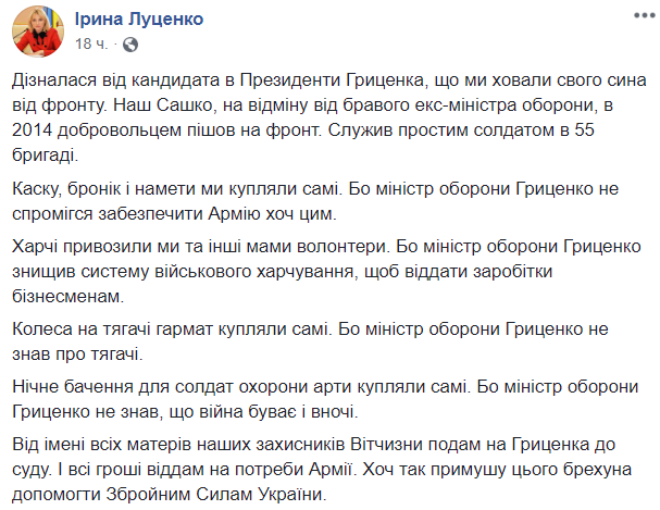 "Узнала от кандидата в президенты Гриценко, что мы прятали своего сына от фронта. Наш Саша, в отличие от бравого экс-министра обороны, в 2014 добровольцем ушел на фронт. Служил простым солдатом в 55 бригаде", - написала Ирина Луценко на странице в соцсети.