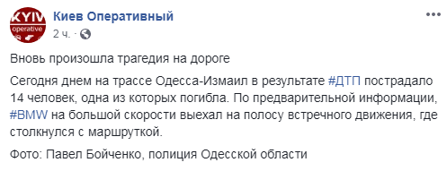 В четверг, 31 января, днем на трассе Одесса-Измаил в результате ДТП пострадало 14 человек. Есть погибший. Об этом сообщает Киев Оперативный.