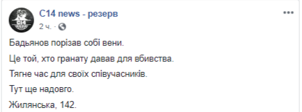 "Исполнители покушения на убийство координатора С14 выйдут под домашний арест! Такая информация ходит по СИЗО и среди правоохранителей. Организатор покушения ездил в Москву договариваться с заказчиком. Судей подкупили. Все порешали. Акимов, Вирченко, Павленко и Бадьянов уже завтра будут дома, или за рубежом. Также параллельно началось заседание по продлению сроков следствия с другим судьей Шум. Именно она по нашей информации взяла деньги и будет отпускать "убийц", - написали накануне на странице  С14.