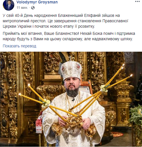 Премьер-министр Владимир Гройсман поздравил Епифания со вступлением на престол. "Примите мои поздравления. Ваше Блаженство! Пусть Божья помощь и поддержка народа будут с Вами на этом сложном, но самом важном пути", - написал он в Facebook.