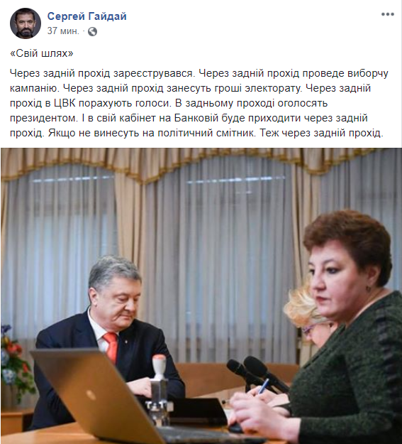 "Свой путь. Через задний проход зарегистрировался. Через задний проход проведет избирательную кампанию. Через задний проход занесут деньги электората. Через задний проход в ЦИК посчитают голоса. В заднем проходе объявят президентом. И в свой кабинет на Банковой будет приходить через задний проход. Если не вынесут на политическую свалку. Тоже через задний проход", - пишет Сергей Гайдай.