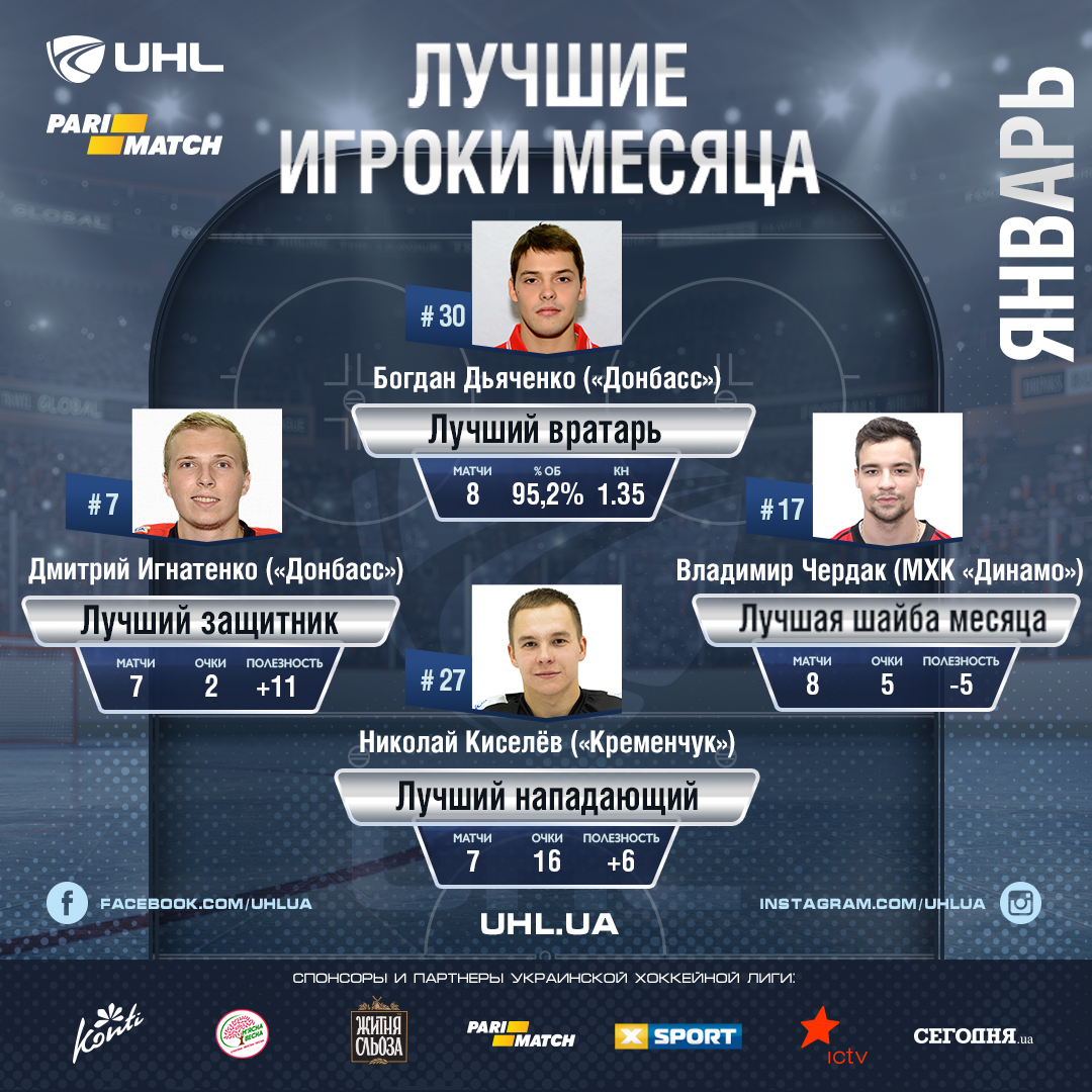 Лучшим форвардом января стал игрок "Кременчука" Николай Киселёв. В 7 матчах нападающий забросил 8 шайб и отдал 8 результативных передач, набирая в среднем по 2,3 очка за игру. В матче против "Донбасса" (4:9) форвард забросил все 4 шайбы своей команды, однако для победы этого оказалось недостаточно.