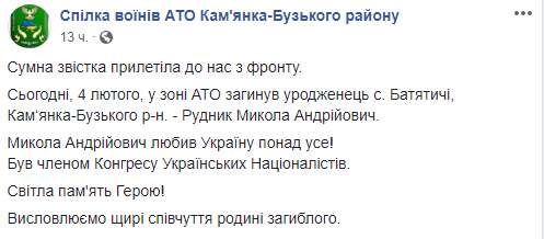 Союз воинов АТО Каменка-Бугского района в Facebook сообщил имя погибшего военного на Донбассе. Это боец из Львовской области Николай Рудник. "Печальная весть прилетела к нам с фронта. 4 февраля в зоне АТО погиб уроженец с. Батятичи Каменка-Бугского района - Рудник Николай Андреевич. Николай Андреевич любил Украину превыше всего. Был членом Конгресса украинских националистов", - сообщили в организации. Семье погибшего бойца выражают соболезнования.