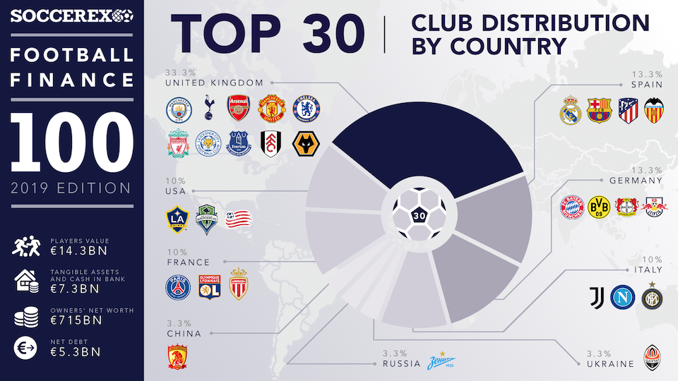 Возглавил же рейтинг Манчестер Сити, обошедший ПСЖ и Баварию. Также в первую десятку вошли Тоттенхэм, Арсенал, Реал Мадрид, Барселона, Манчестер Юнайтед, Ювентус и Челси.